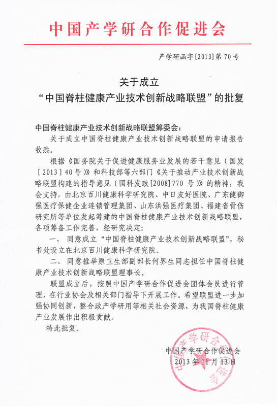 中国脊柱健康产业技术创新战略联盟(以下简称“联盟”)经中国产学研合作促进会批准,于2013年成立。中国脊柱健康产业技术创新战略联盟(以下简称“联盟”)经中国产学研合作促进会批准,于2013年成立。